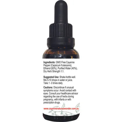Ingredients: GMO Free Cayenne Pepper (Capsicum Frutescens), Ethanol (60%), Purified Water (40%), Dry Herb Strength 1:1.