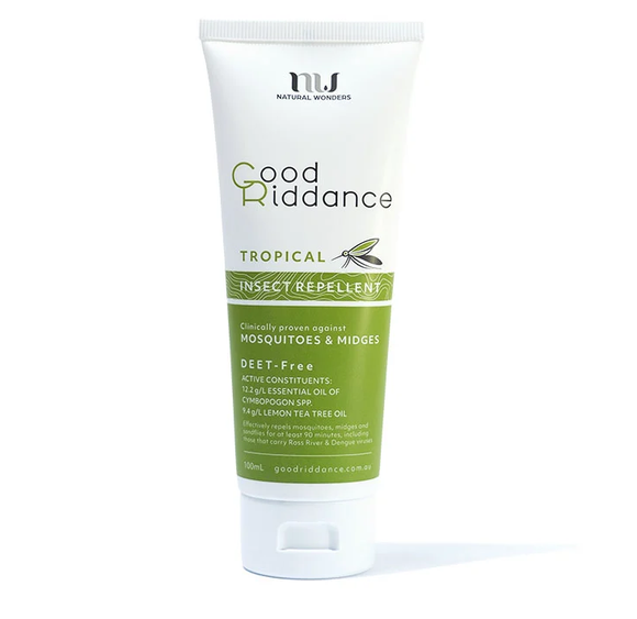 Good Riddance Tropical is designed to provide long-lasting, tropical strength protection against mozzies, midges and sandflies. The days of sticky, smelly DEET repellents are finally behind you! Good Riddance Tropical has a fresh, vibrant citrus aroma with a woody undertone and notes of Australian natives.